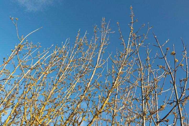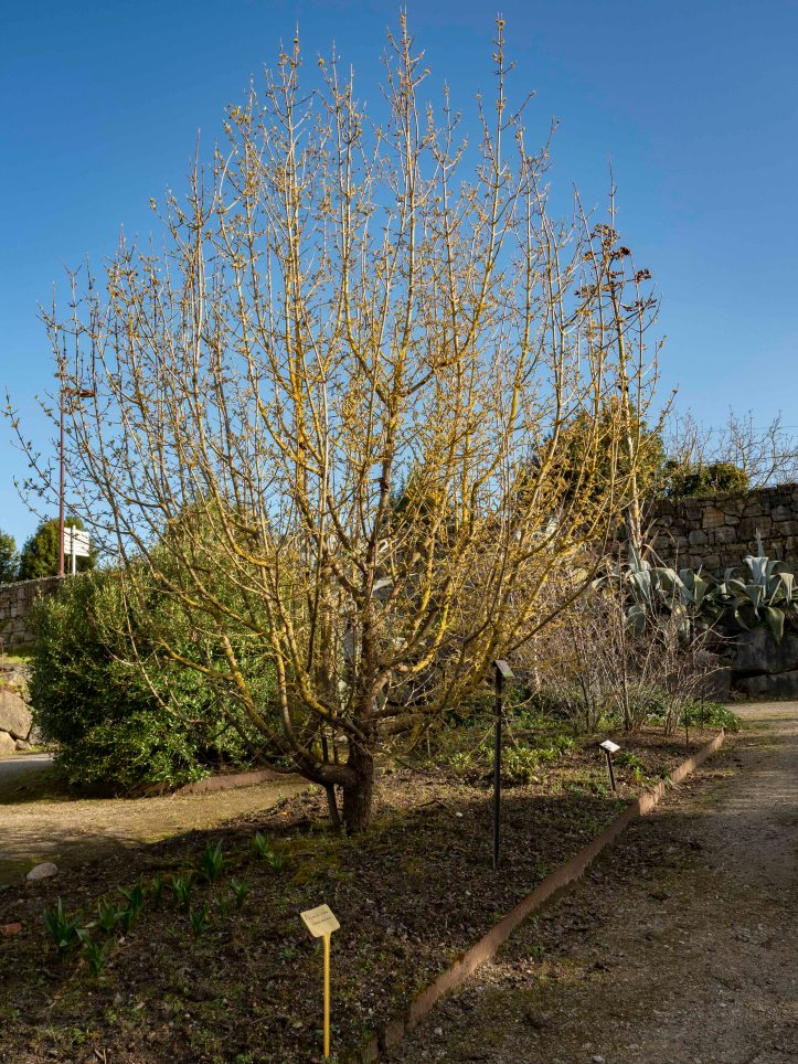 El cornejo macho es un árbol caducifolio de tamaño mediano. Tiene racimos de flores desde finales del invierno hasta principios de la primavera y produce bayas rojas en el verano.
