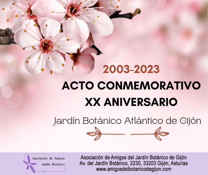 Con motivo de este evento, la Asociación de Amigos del Jardín Botánico de Gijón prepara un sencillo acto conmemorativo que tendrá lugar en el mismo Jardín Botánico, a las 12 de la mañana del día 25 de abril, en el que las personas que han ejercido, hasta la fecha, la presidencia de esta Asociación y el actual Director del Jardín Botánico, nos dirigirán unas palabras. Seguidamente se llevará a cabo una visita guiada por el Jardín para disfrutarlo en una época tan esplendida como es la primavera.